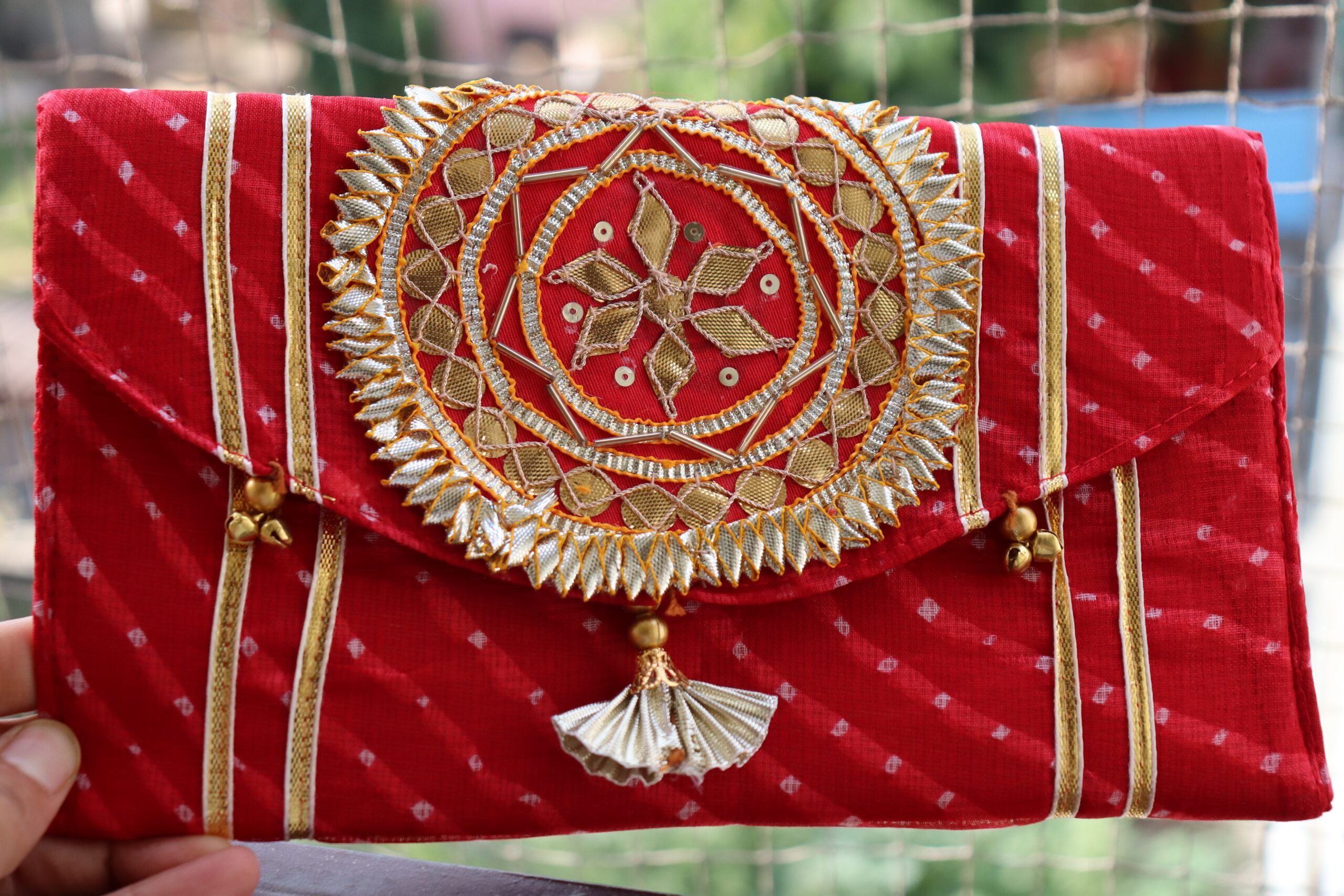A vibrant tribute to the artistry of Jaipur, this Jaipuri clutch is a true statement piece. Handcrafted from rich red fabric, it features the intricate Bandhani tie-dye pattern, a hallmark of traditional Rajasthani textiles. The front is adorned with a stunning centerpiece of Gota Patti work, showcasing delicate metallic embroidery and mirrored accents. Tiny golden bells, known as ghungroos, dangle from the corners, adding a touch of playful charm. Perfect for festive occasions, weddings, or adding a pop of color to any outfit, this clutch is a beautiful blend of traditional technique and modern style.