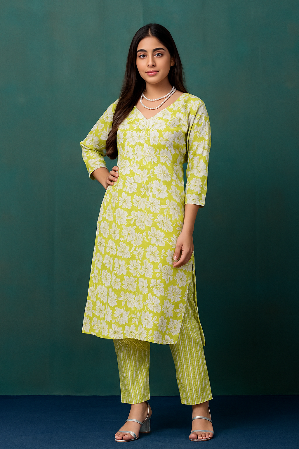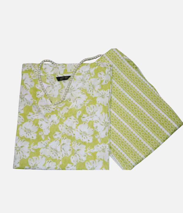 Add a splash of freshness to your wardrobe with the Lime Garden Floral Kurta Set. The kurta showcases an all-over floral pattern in crisp white on a lime background, paired beautifully with a geometric-striped matching bottom. Made from soft cotton, it’s ideal for warm weather and easy everyday style.