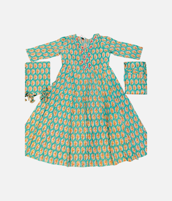Celebrate Indian heritage in style with this elegant Teal Block Print Anarkali Kurta Set. Crafted from soft, breathable cotton, this full-length kurta features a beautifully flared design with all-over traditional block print motifs in shades of orange and white. The kurta is designed with a defined waistline and comfortable fit, offering a graceful flow that enhances your ethnic charm. It comes paired with matching bottoms and a printed dupatta, completing the coordinated look. Whether you’re heading to a casual get-together, a family function, or simply love wearing Indian wear daily, this outfit offers both style and ease. The intricate detailing around the neckline and front button accents adds a subtle touch of sophistication. Pair it with oxidized jewelry and juttis to complete the look. A perfect blend of comfort, culture, and everyday elegance.